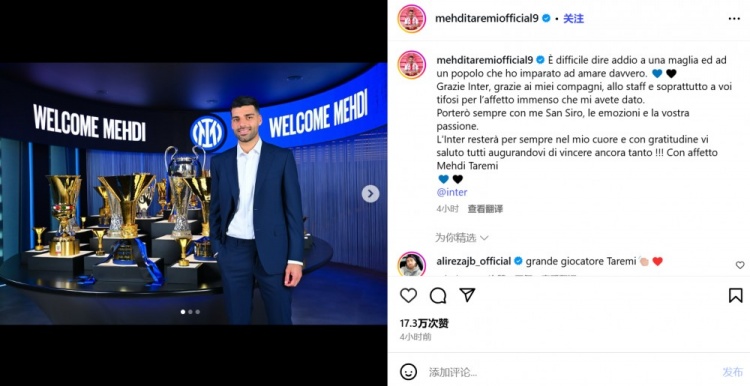 “国际米兰会一直留在我心里。谨以最真诚的感激向你们道别,祝愿球队未来赢得更多荣誉!致以最深切的感情。——梅赫迪-塔雷米。”