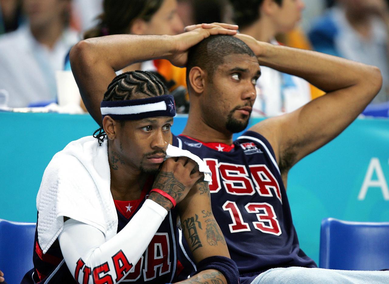 2004年,主教练拉里-布朗带去雅典的阵容饱受伤病或其他日程冲突的困扰。赢下2003年国际篮联美洲杯冠军的12名美国男篮球员中,有9人没有参加一年后的奥运会。只有蒂姆-邓肯、阿伦-艾弗森和理查德-杰弗森留下了。处于巅峰时期且有经验的球员沙奎尔-奥尼尔、凯文-加内特、雷-阿伦、科比和基德都没有出战。